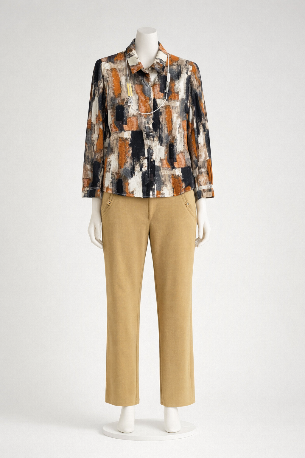 Ensemble chic et moderne – Chemisier imprimé & pantalon beige