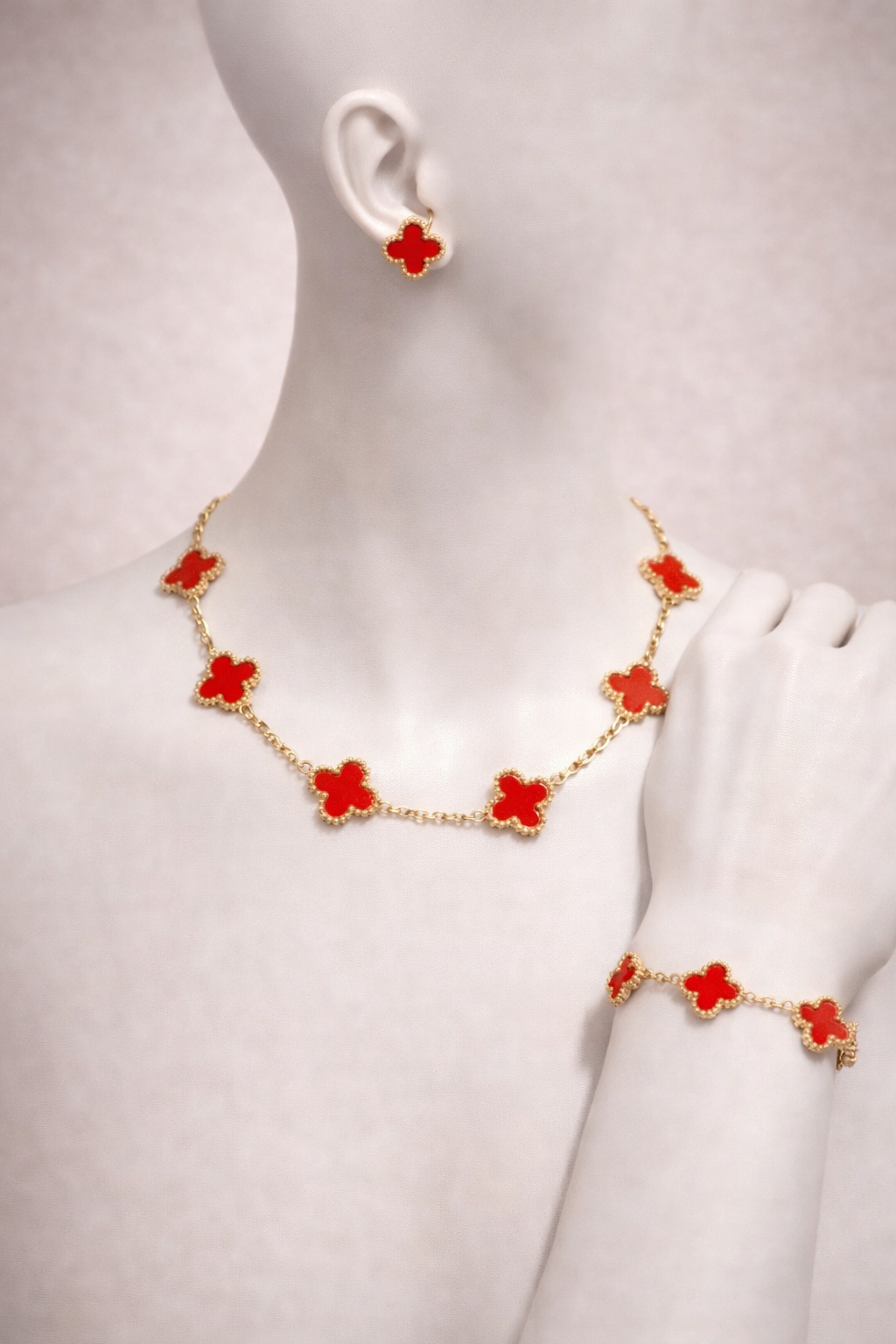 Apportez une touche de luxe et de féminité à votre style avec cet ensemble de bijoux raffiné composé d’un collier, d’un bracelet et de boucles d’oreilles assorties. Chaque pièce est sublimée par de délicats motifs en forme de trèfle, ornés d’un rouge éclatant et encadrés d’une finition dorée brillante.