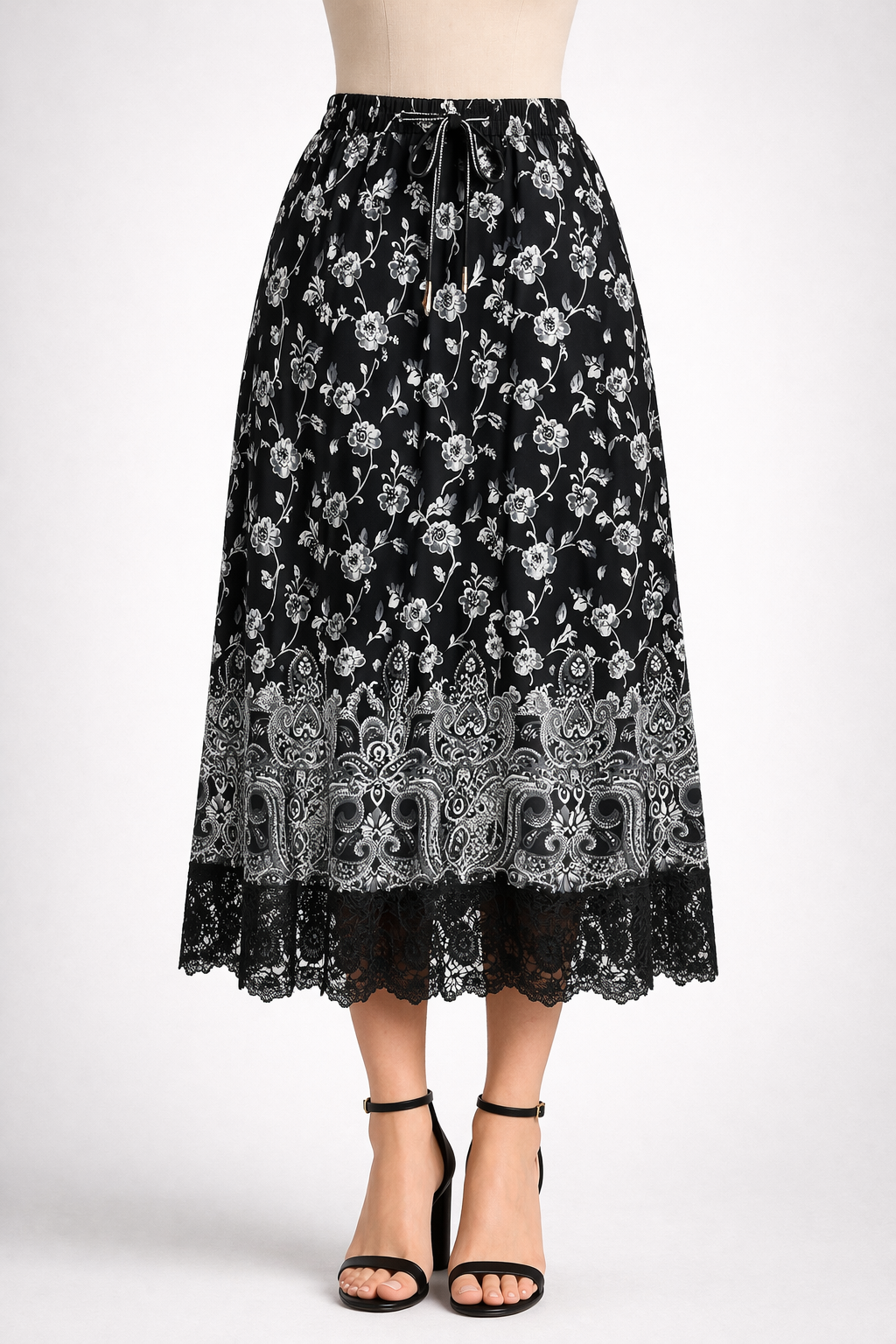 Jupe midi noire à imprimé floral blanc avec motif décoratif au bas, parfaite pour un look élégant et classique. Sa coupe fluide offre un tombé léger et confortable, tandis que la taille élastique avec cordon assure un ajustement facile. La finition en dentelle noire ajoute une touche féminine et raffinée, idéale pour toutes les occasions.