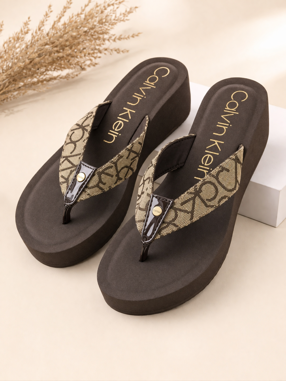 Adoptez un style confortable et tendance avec ces sandales compensées marron au design élégant. Elles sont dotées d’une bride imprimée motif classique avec finition brillante, offrant une touche chic. La semelle compensée assure une légère hauteur tout en garantissant un confort optimal pour toute la journée.